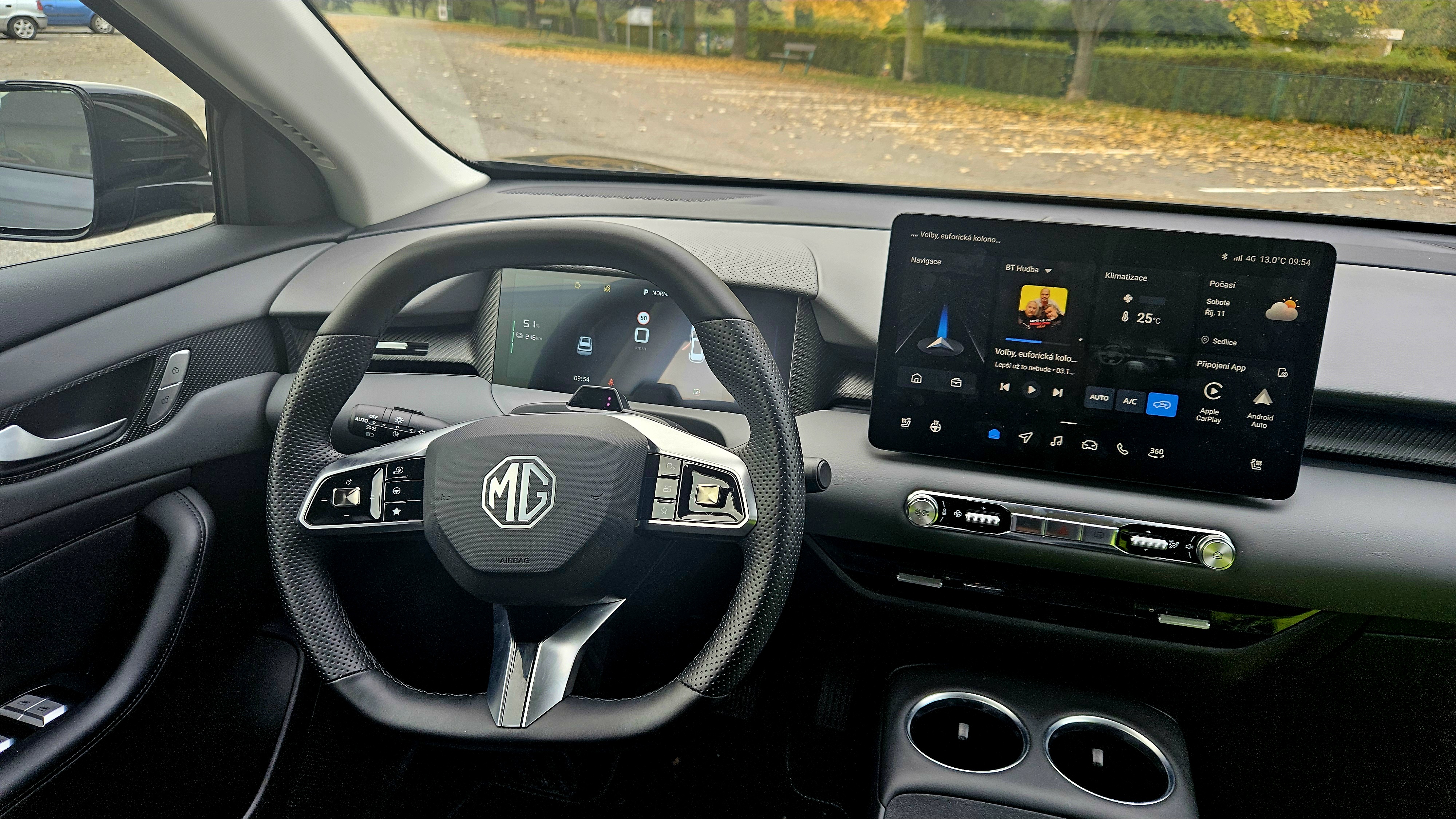 Oproti MG4 byl celý interiér modernizován, má lepší použité materiály a upravená byla i palubní deska. Té dominuje 10,25palcový digitální přístrojový štít a vždy 12,8palcový centrální dotykový displej. Ten nabízí vcelku intuitivní ovládání, hezkou grafiku – až na navigační mapu, které se mi ve vozech MG prostě subjektivně nelíbí – a integrované aplikace včetně bezdrátového Apple CarPlay a Android Auto. Velkým bonusem je pár fyzických tlačítek pro ovládání klimatizace nebo hlasitosti audiosystému.