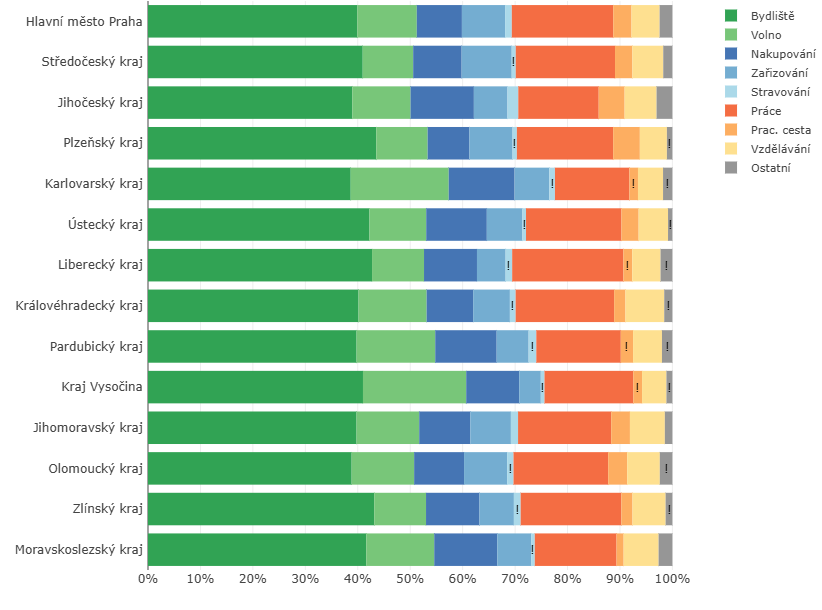 Pracovní cesty se na všech cestách realizovaných Čechy podílejí 3 %, nejvíce (5,1 %) v Plzeňském kraji